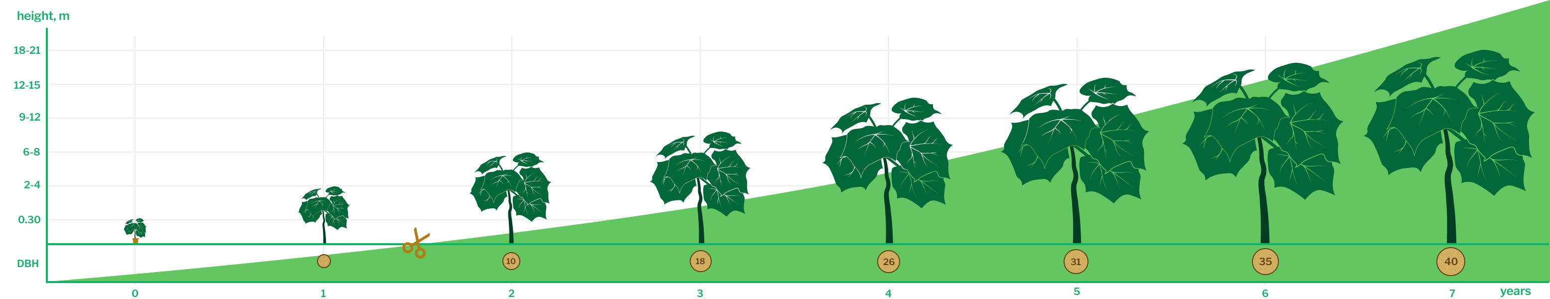 Paulownia Professional provides data and graphs of the three prevalent species of Paulownia Pao Tong Z07, Shan Tong, Elongata, which shows the averaged data on the growth rate and the tendency to increase trunk diameter.